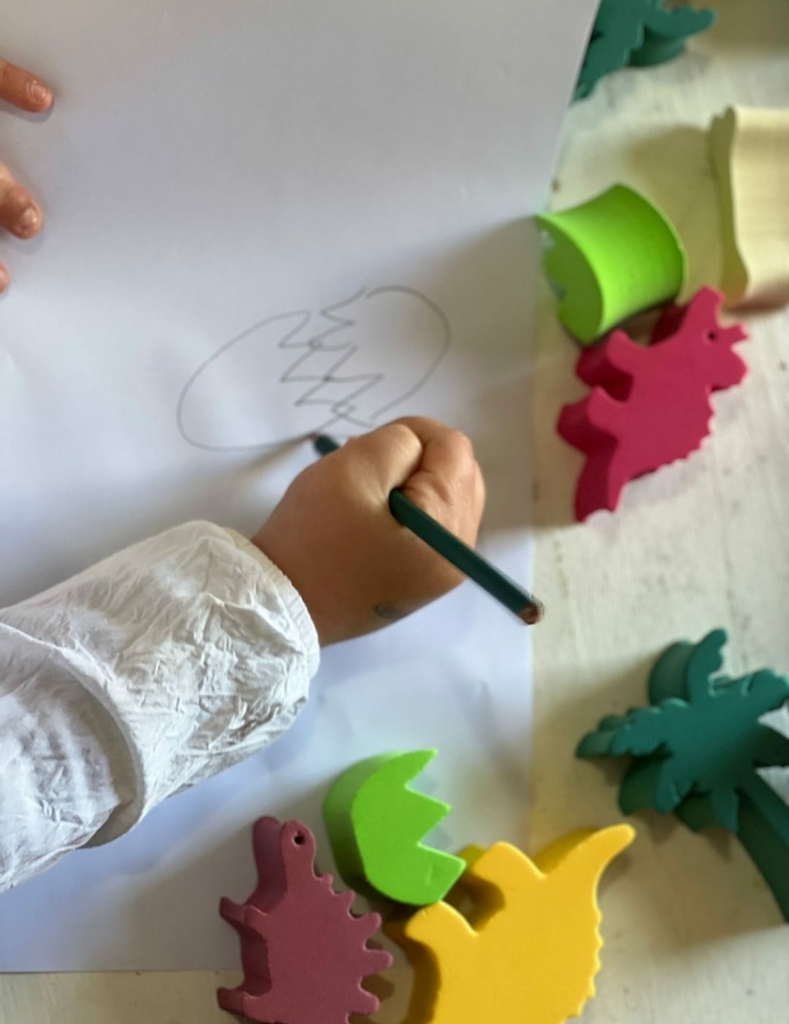 10 dinosaurios + 3 huevos encastrables + 3 huesitos + 2 palmeras prehistóricas.